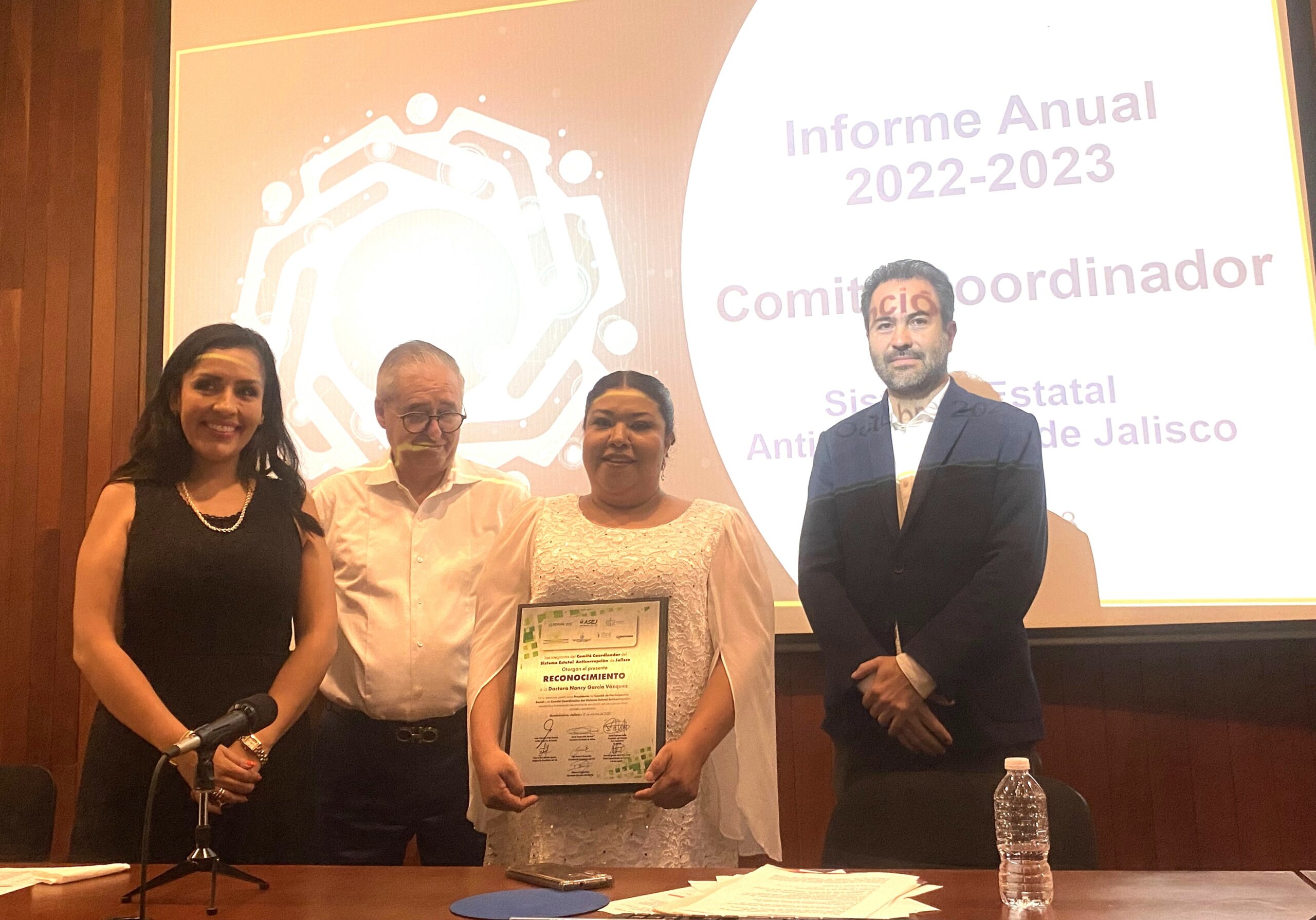 En el acto fue reconocida, por las y los integrantes del Comité Coordinador del SEA Jalisco, por sus aportaciones para la consolidación Sistema Estatal Anticorrupción de Jalisco, impulsando y fortaleciendo mecanismos de vinculación con Organizaciones Sociales y Académicas.