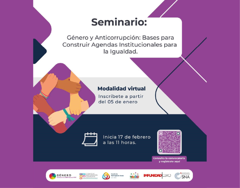 La Comisión de Género de la Red Nacional de CPCs, el Comité de Participación Ciudadana del Sistema Nacional Anticorrupción, el Comité de Participación Social del Sistema Anticorrupción de Jalisco, el Comité de Participación Ciudadana del Sistema Anticorrupción de Campeche e Impunidad Cero, invitan a las personas interesadas en comprender, analizar y transformar la relación entre género y combate a la corrupción a participar en este seminario nacional.