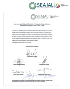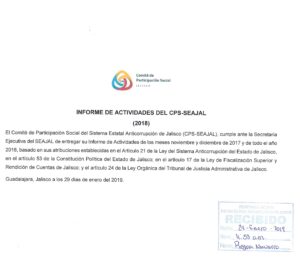 En cumplimiento con la atribución estipulada en la fracción IV del artículo 22 bis numeral 1 de la Ley del Sistema Anticorrupción del Estado de Jalisco, los integrante del Comité de Participación Social deben Presentar en el mes de febrero, en lo individual, un informe anual de sus actividades a la Secretaría Técnica, quien deberá remitirlo al Congreso del Estado.